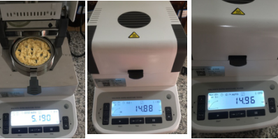 測試樣品2:為了檢測儀器的精確性,待儀器溫度降至50℃以下時進行第二次測試,用實驗勺提取5.5克飼料,置于不銹鋼托盤中,用實驗藥勺將飼料平鋪均勻,溫度設置135℃用儀器進行加熱,約15分鐘后檢測結(jié)束,檢測數(shù)據(jù)顯示14.88%;